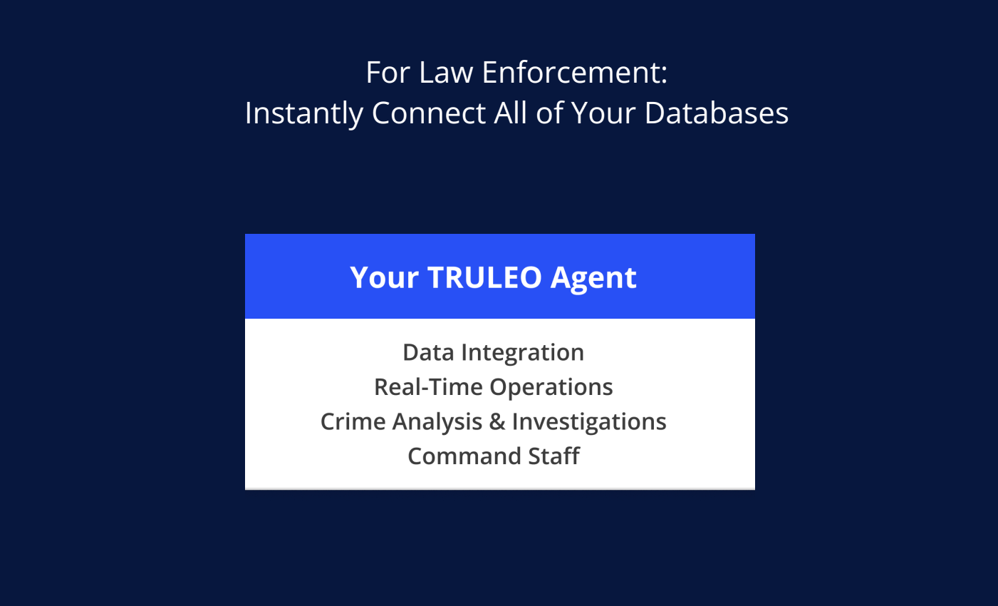 TRULEO connects directly to your existing systems: CAD, RMS, BWC, jail calls, OSINT, etc, & performs real work: analytical tasks, monitoring, reporting, & ops.